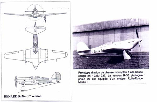 - Conception en 1936-37 d’un avion de chasse monoplace, monoplan à aile basse, qui fut construit en trois versions prototypes différant par leur motorisation en 1937-38 : R36 (moteur Hispano-Suiza 12 cylindres), R37 (moteur Gnome et Rhône 1050 CV refroidi à l’air), R38 (moteur Rolls-Royce Merlin II à refroidissement liquide).