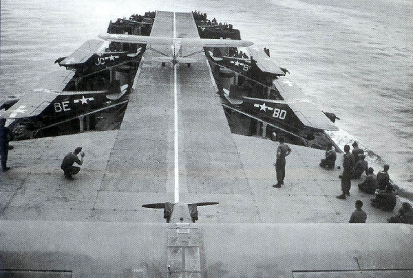 De L-4B van kapitein Devol is klaar om op te stijgen van de LST 386, die aan zijn maximumsnelheid van 10 knopen tegen de wind vaart.