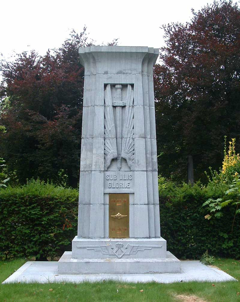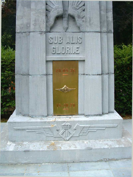 Dit monument, dat op het vliegterrein van Evere werd opgericht, werd op 28 september 1936 door de Kolonel Vlieger De Smedt, commandant van de School van het Vliegwezen ingehuldigd. Na verandering van de bestemming van de terreinen op het vliegveld, moest het monument verplaatst worden en werd opnieuw opbouwd in 1978 in het Kwartier Albert I. Het werd plechtig ingehuldigd op zijn nieuwe plaats op 12 oktober 1980 door de Luitenant-Generaal Vlieger De Smet, Stafchef van de Luchtmacht.