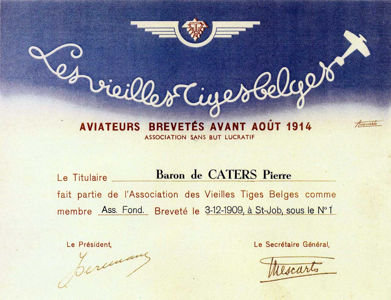 Bij zijn terugkeer in België verneemt baron de Caters dat de Aëroclub van België in navolging van Frankrijk, hem op 3 december het eerste Belgisch vliegeniersbrevet toekent. Zo verschijnt onze held officieel in de luchtvaartgeschiedenis als eerste Belgische piloot. In het dagblad “Le Figaro” van 16 februari 1910 wordt baron de Caters als enige Belg vermeld tussen 16 vliegeniers van over de ganse wereld die er in geslaagd zijn een vlucht van minimum één uur uit te voeren.
