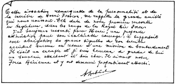 « Cette évocation remarquable de la parsonnalité et de la carrière de Henri Fossion, me rappelle la grande amitié qui nous unissait. Elle date de notre prmière rencontre en Angleterre, dans les rangs de la Royal Air Force.