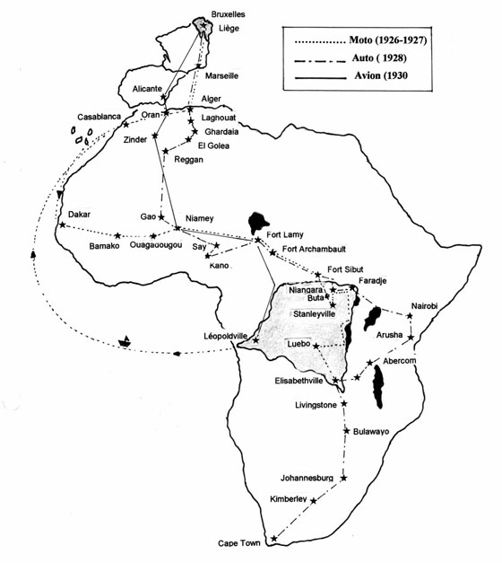 Dakar-Bamako-Ouagadougou-Niamey-Kano-Lac Tchad-Fort Lamy-Fort Archambaut Fort Sibut –Stanleyville-Buta-Niangara-Remoken-Rivière Bar el Gazhal-Nairobi-Kabako via Rutchuru en franchissant la montagne par porteurs -Lac Tanganika-Kabalo-Luebo-Elisabethville.