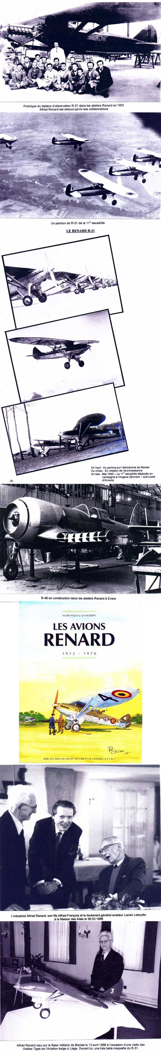 Pour conclure cette liste de réalisations marquantes, il faut rappeler que Alfred Renard développa les projets de plus d’une vingtaine de types d’avions différents, dont la majorité furent réalisés et testés en vol. Les R.S.V. et le R31 ont été fabriqués en série, à l’échelle de notre pays, mais tous les appareils ont été détruits pendant le conflit de 1940-45. Aujourd’hui, des bénévoles ont entrepris de réaliser une maquette réplique en bois à l’échelle unitaire du R31.