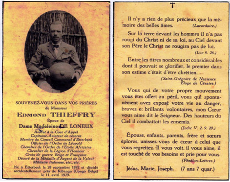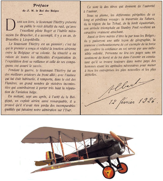 Enfin, nous tenons à publier intégralement la préface rédigée par Sa Majesté le Roi Albert I au récit qu’Edmond Thieffry publie en 1926, après avoir accompli la première liaison aérienne Belgique-Congo. On ne pouvait rendre plus bel hommage à ce héros et pionnier de notre aviation